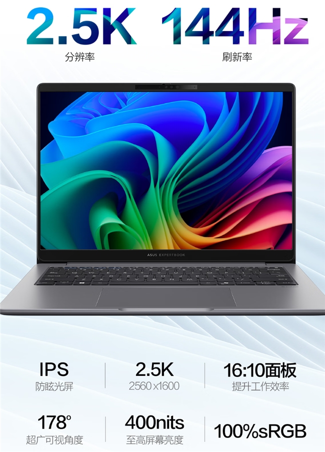 屏幕方面,华硕破晓6S锐龙版该机配备一块14英寸2.5K分辨率IPS高刷护眼屏,拥有144Hz刷新率、100% sRGB高色域和400nits峰值亮度,无论是审阅色彩敏感的视觉内容,还是长时间浏览文档与网页,都能提供流畅、细腻、真实的视觉体验。硬件级低蓝光技术有效呵护用眼健康。