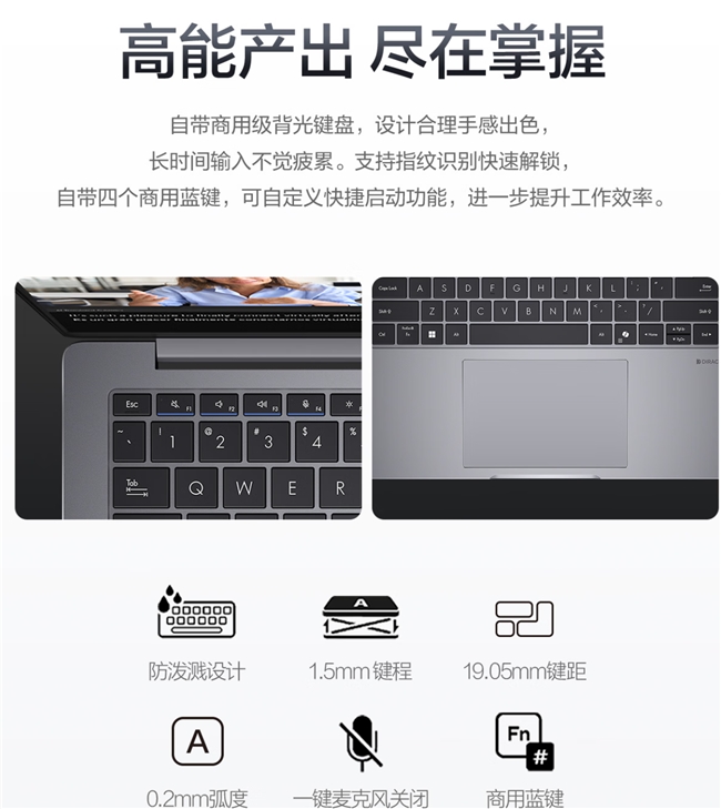 商用级背光键盘确保长时间输入的舒适性,四颗可自定义快捷键使常用操作一键直达。集成指纹识别的电源键实现一键安全登录,在保障数据安全的同时提升使用便捷性。