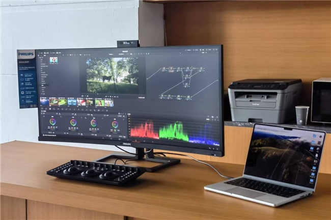 其中,针对现场后期剪辑体验区应用,飞利浦超宽商用显示器40B1U6903CH分别搭载键鼠设备及专业调色台硬件,打造多种主流后期调色场景方案,重塑剪辑体验。凭借超宽比例屏幕与多源同屏技术,以及5K超清显示、广色域覆盖等专业级性能表现,剪辑师可在一屏内同时展开时间轴、素材库、预览窗口及调色面板,告别频繁切换视图的割裂感,直观调整画面节奏与色彩基调。与专业调色台硬件协同工作下,进一步实现色彩参数的实时精细调控,让剪辑师在宽屏视野中同步完成多任务操作与调色微调,极大提升了后期制作的流畅度与创作自由度。