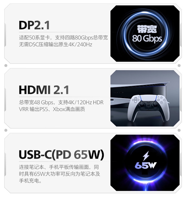 32M2N8900X还配备了DP2.1接口,提供高达80Gbps的满血传输带宽,支持无损信号传输,有效避免画面压缩与切换黑屏。此外HDMI2.1接口总带宽48Gbps,为连接多种游戏主机及设备提供高速可靠的传输保障。Type-C接口则可连接笔记本、手机平板传输画面,同时具有65W大功率,可反向为笔记本及手机充电。